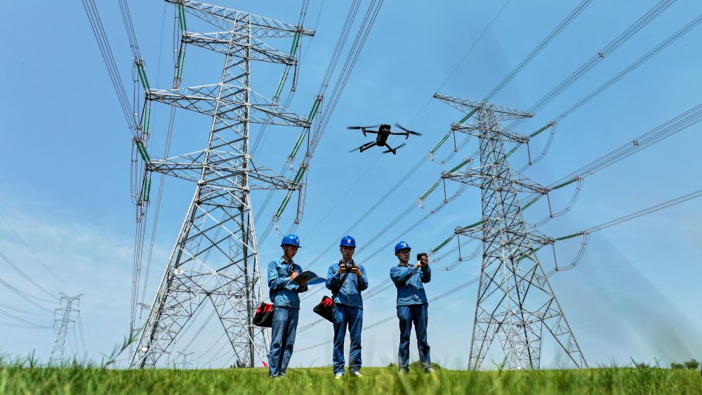 面對(duì)安徽、江蘇持續(xù)高溫,皖蘇兩省的電力工人聯(lián)合對(duì)省際聯(lián)絡(luò)線及相關(guān)配電設(shè)施進(jìn)行檢修,并開(kāi)展輸變電設(shè)施巡視檢查。這是在安徽省滁州市南譙區(qū),電力工人運(yùn)用無(wú)人機(jī)對(duì)500千伏輸電線路進(jìn)行巡視檢查(2024年8月9日攝)。新華社記者 曹力 攝