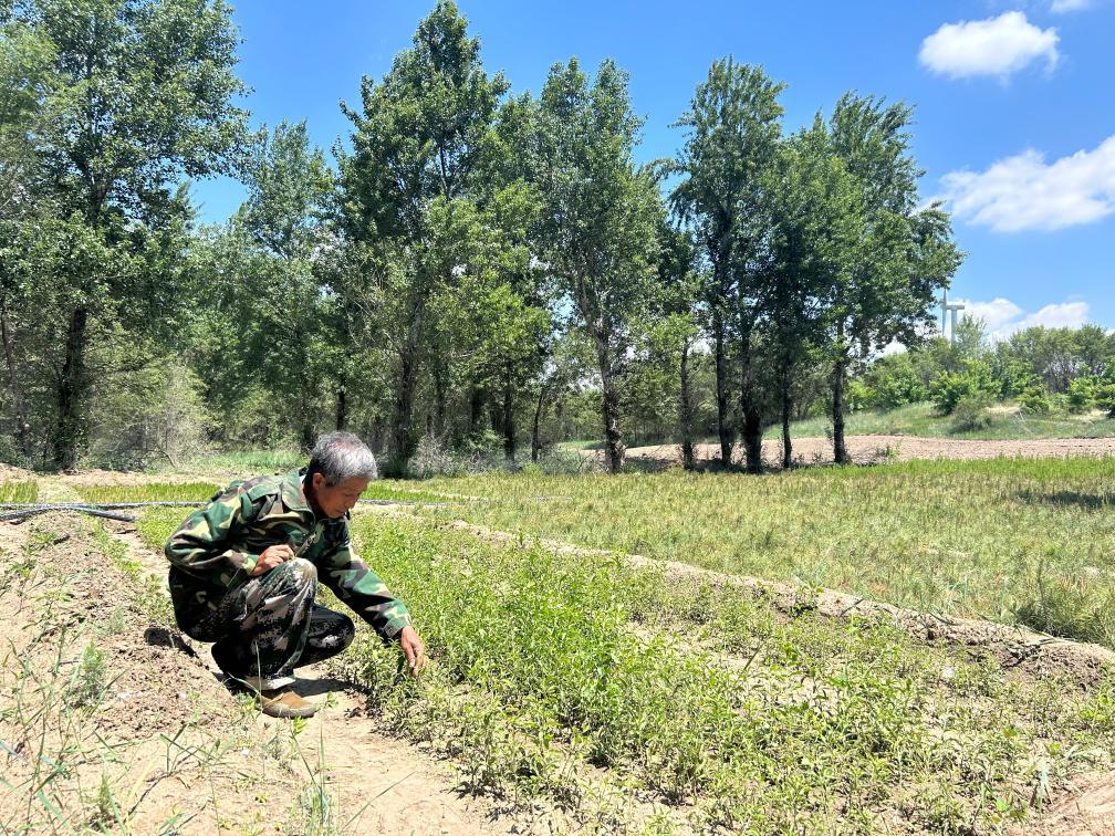 遼寧省阜新市彰武縣四合城鎮(zhèn)劉家村村民侯貴正在拔除影響枸杞苗生長的雜草(2025年6月4日攝)。新華社記者 高爽 攝