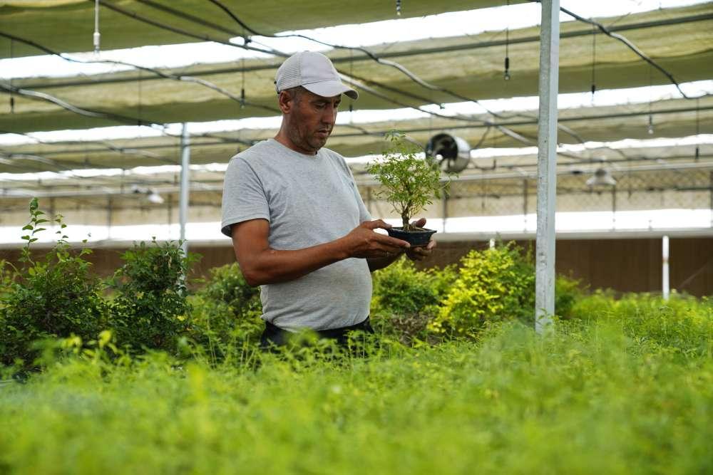 2024年7月28日,在烏茲別克斯坦錫爾河州的上合組織農(nóng)業(yè)基地中烏現(xiàn)代農(nóng)業(yè)科技示范園,工作人員檢查盆栽植物。新華社發(fā)(扎法爾攝)