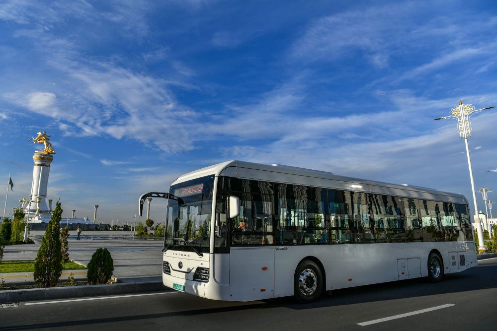 這是2023年11月26日在土庫曼斯坦阿爾卡達(dá)格拍攝的電動(dòng)公交車。新華社記者 曹陽 攝