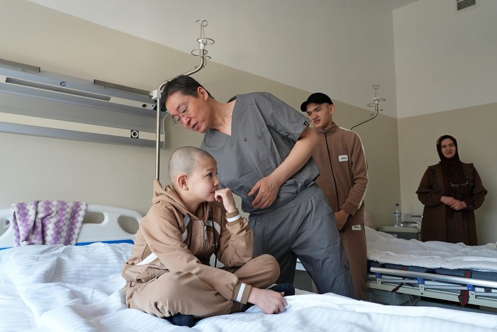 2025年2月20日,在位于烏茲別克斯坦塔什干的共和國耳鼻喉科及頭頸疾病專業(yè)科學(xué)實(shí)踐醫(yī)療中心,劉玉和醫(yī)生(左二) 在術(shù)前查看患兒情況。新華社發(fā)(扎法爾攝)