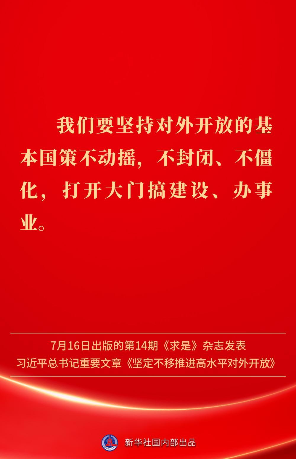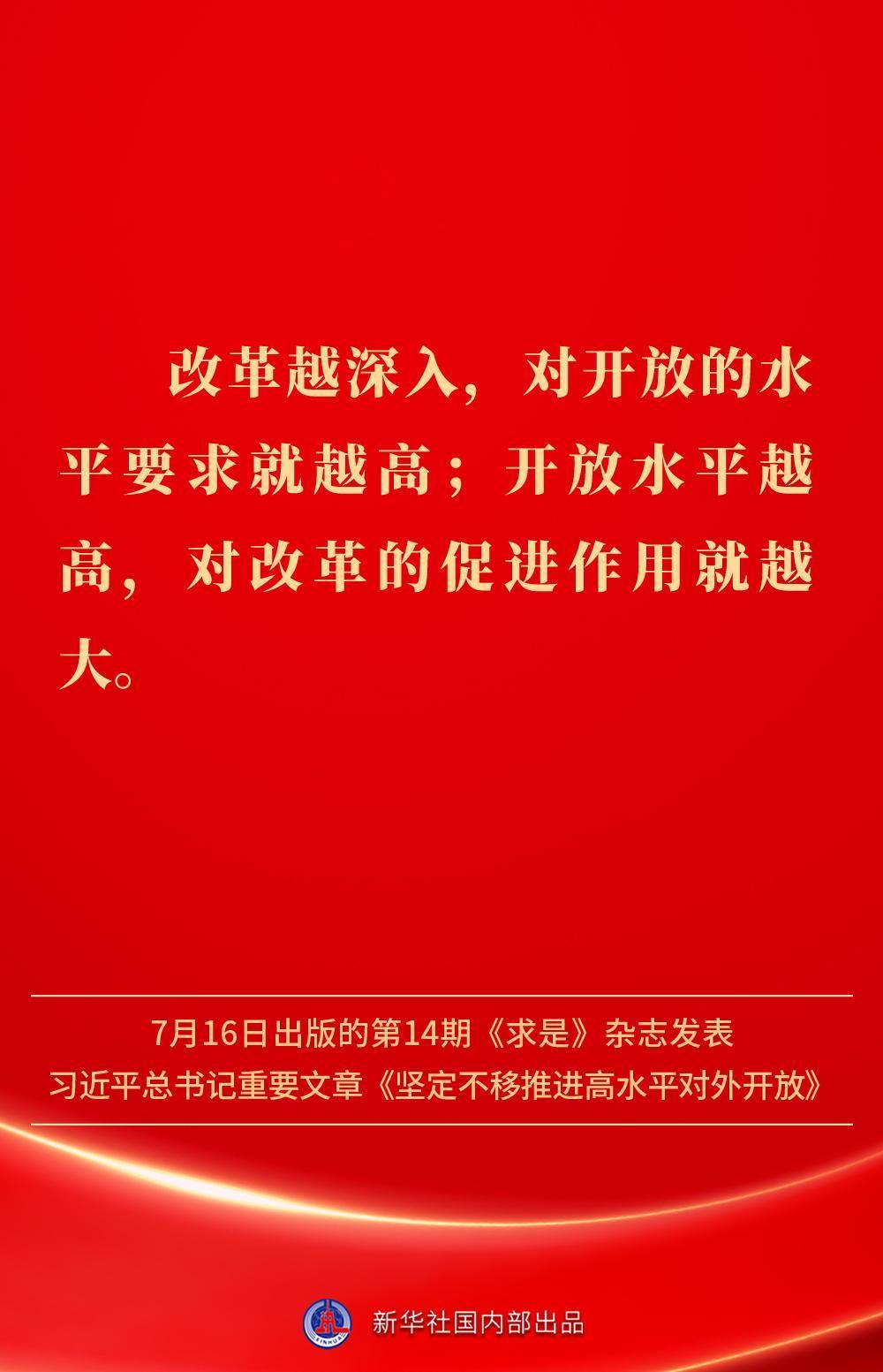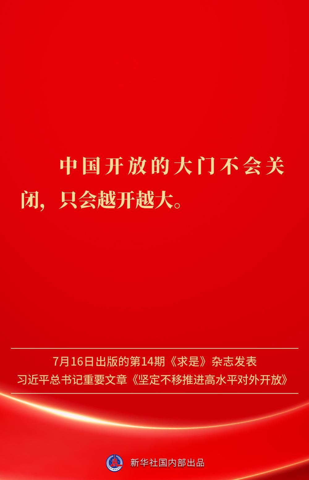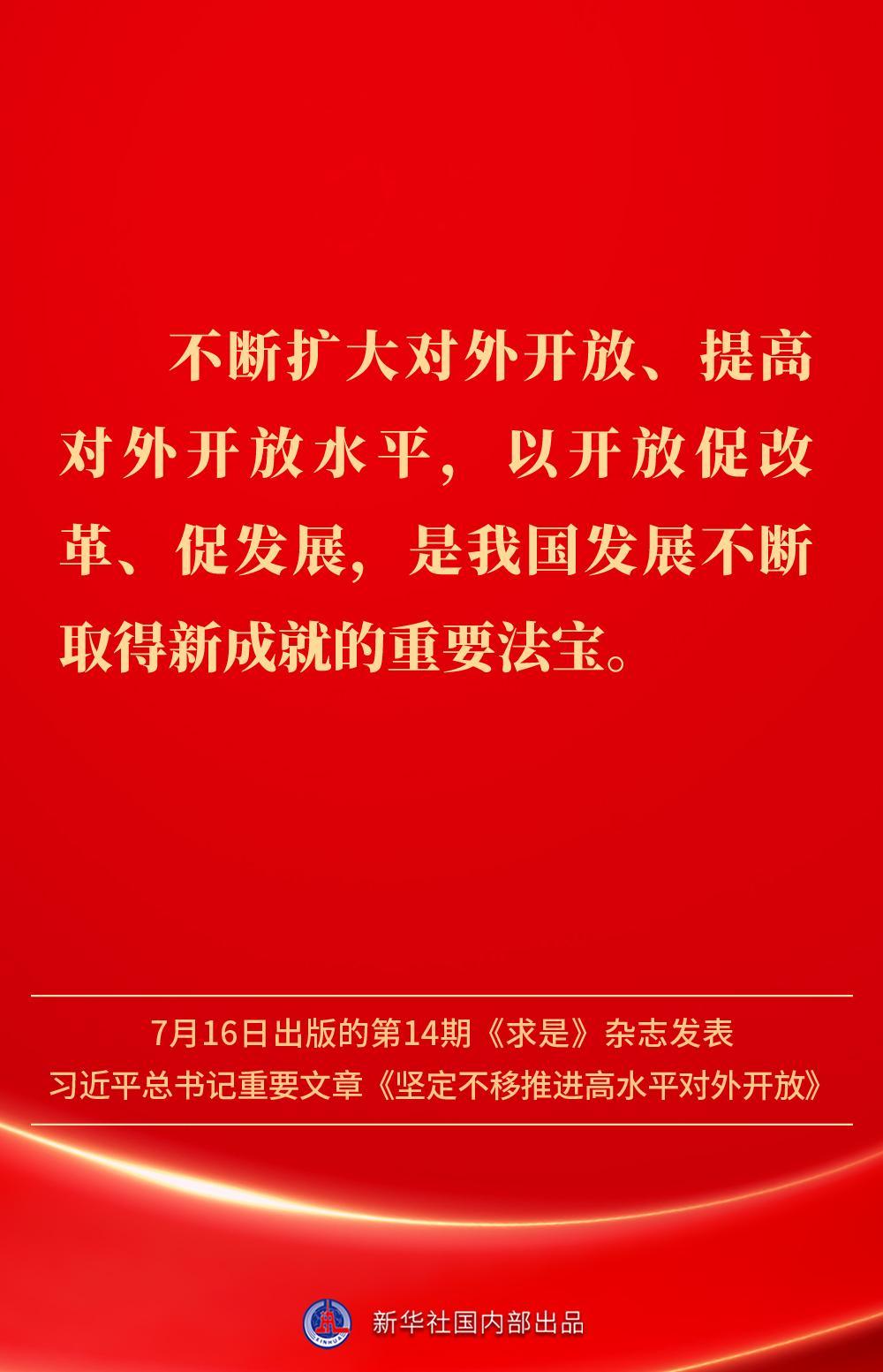 7月16日出版的第14期《求是》雜志發(fā)表習(xí)近平總書記重要文章《堅定不移推進高水平對外開放》。文章強調(diào),中國的發(fā)展離不開世界,世界的繁榮也需要中國。不斷擴大對外開放、提高對外開放水平,以開放促改革、促發(fā)展,是我國發(fā)展不斷取得新成就的重要法寶。堅定不移推進高水平對外開放,總書記這樣闡明——