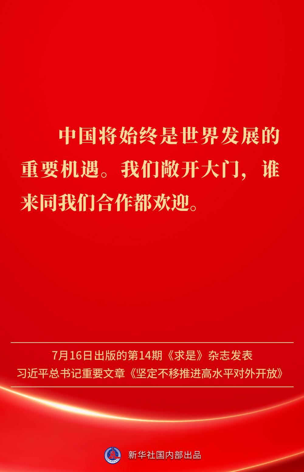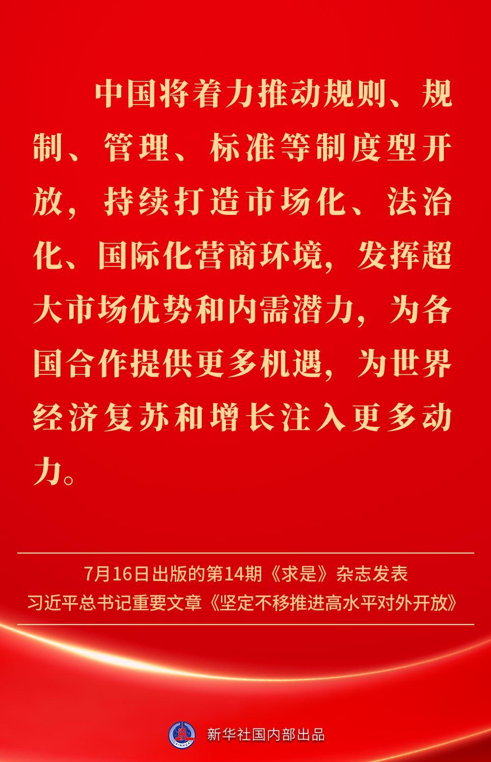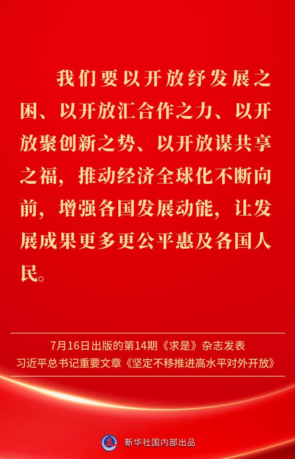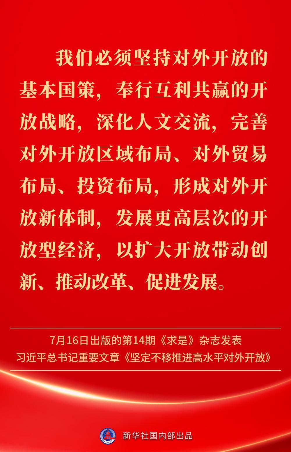 7月16日出版的第14期《求是》雜志發(fā)表習(xí)近平總書記重要文章《堅定不移推進高水平對外開放》。文章強調(diào),中國的發(fā)展離不開世界,世界的繁榮也需要中國。不斷擴大對外開放、提高對外開放水平,以開放促改革、促發(fā)展,是我國發(fā)展不斷取得新成就的重要法寶。堅定不移推進高水平對外開放,總書記這樣闡明——