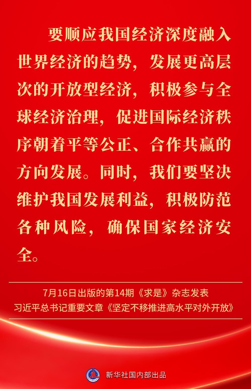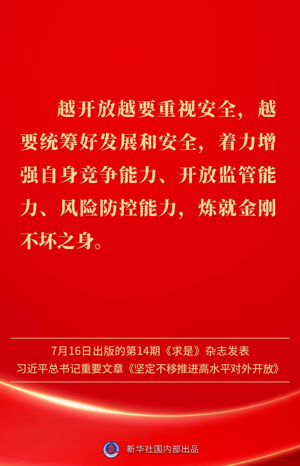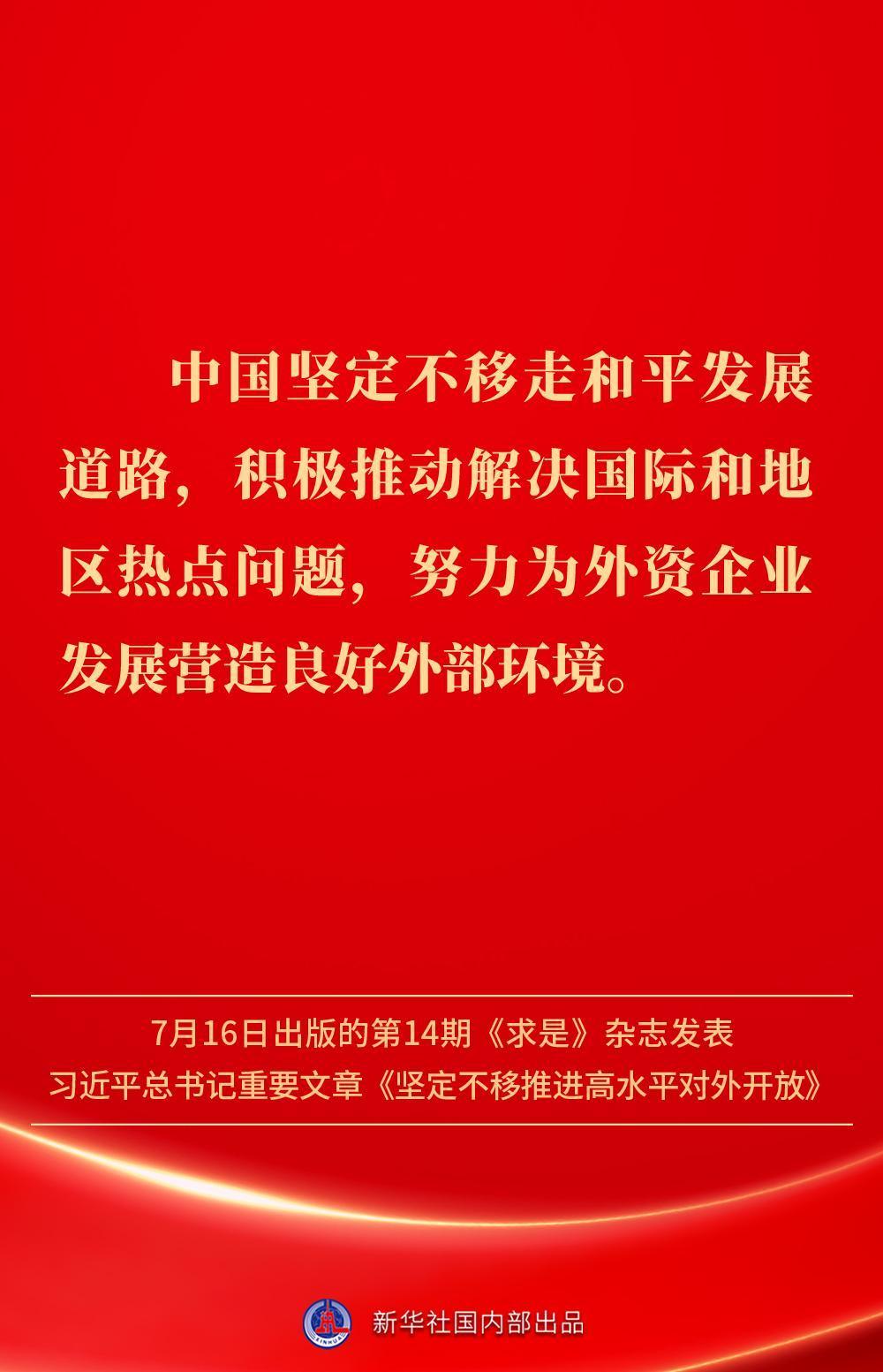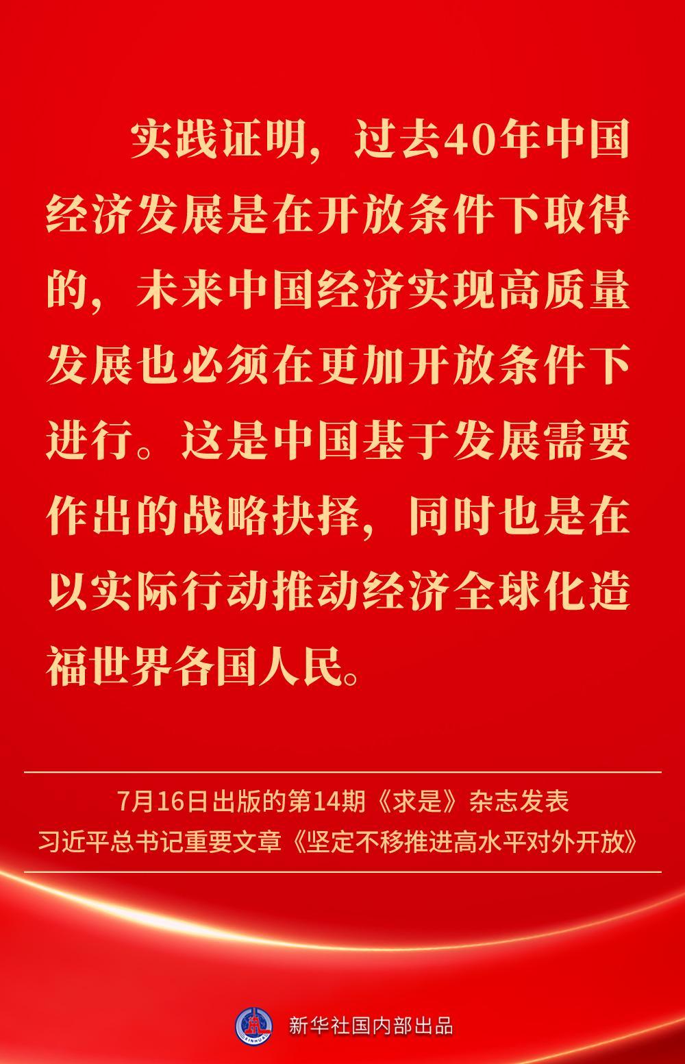 7月16日出版的第14期《求是》雜志發(fā)表習(xí)近平總書記重要文章《堅定不移推進高水平對外開放》。文章強調(diào),中國的發(fā)展離不開世界,世界的繁榮也需要中國。不斷擴大對外開放、提高對外開放水平,以開放促改革、促發(fā)展,是我國發(fā)展不斷取得新成就的重要法寶。堅定不移推進高水平對外開放,總書記這樣闡明——