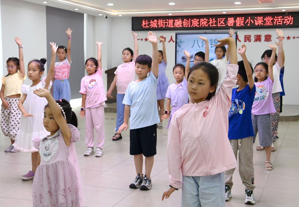 2024年7月11日,小朋友在陜西省西安市雁塔區(qū)融創(chuàng)宸院社區(qū)的暑假小課堂上練習(xí)八段錦。為緩解未成年人暑期托管難的問題,西安市雁塔區(qū)多個社區(qū)聯(lián)合大學(xué)生志愿者、社會組織、志愿商戶等共同為轄區(qū)居民提供暑期公益小課堂服務(wù),豐富未成年人的暑期生活,解決家長的后顧之憂。