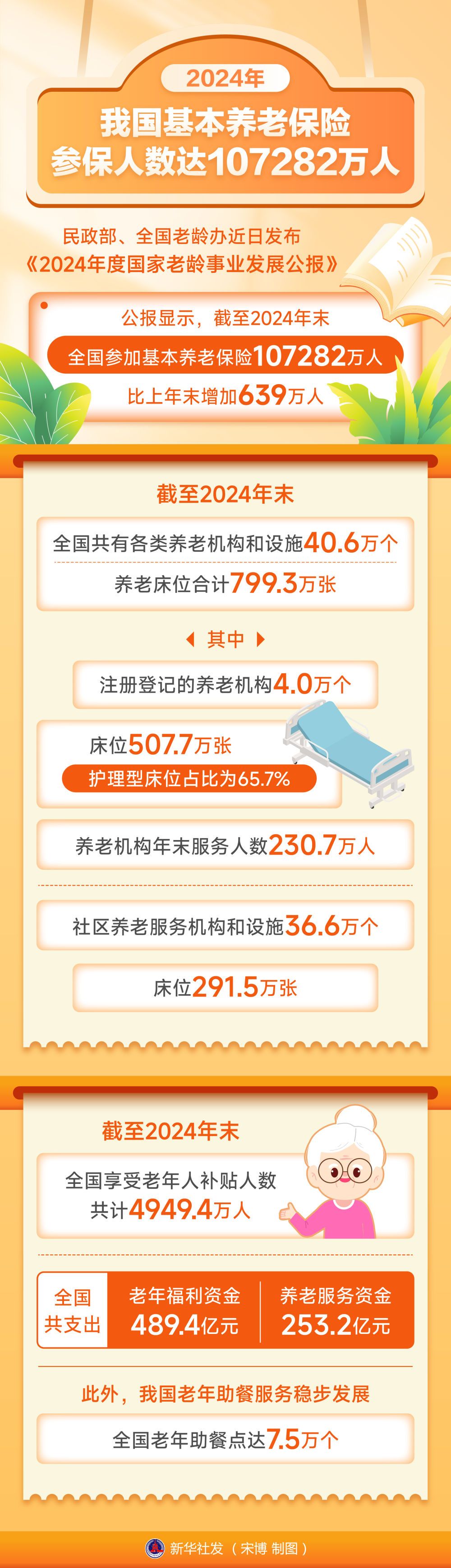 截至2024年末,全國參加基本養(yǎng)老保險107282萬人,基本養(yǎng)老保險參保率達(dá)95%,提前達(dá)成“十四五”規(guī)劃目標(biāo)。