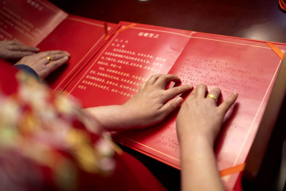 2024年3月12日,在北京市西城區(qū)婚姻登記服務(wù)中心,新人張女士和王先生提前熟悉無障礙版結(jié)婚誓言準(zhǔn)備進(jìn)行結(jié)婚宣誓。這是我國首次為視障人士提供結(jié)婚登記無障礙格式文件。