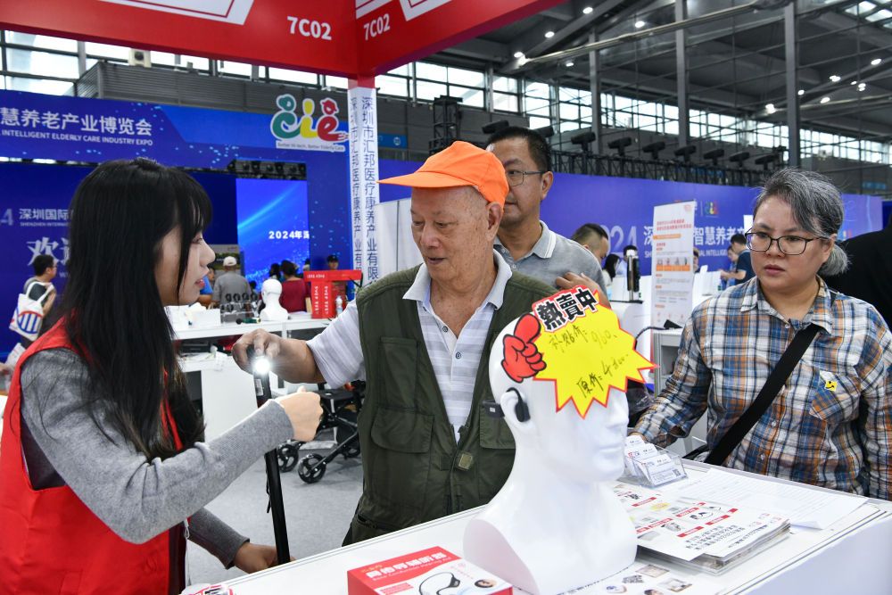 2024年10月27日,一位老人在2024深圳國際智慧養(yǎng)老產(chǎn)業(yè)博覽會上了解一款智能手杖。本屆博覽會集中展示超過1000種智慧養(yǎng)老產(chǎn)品和技術(shù),覆蓋智慧產(chǎn)品、適老化改造、智能輔具、老齡科技、養(yǎng)老金融及康養(yǎng)教育等多元化領(lǐng)域。