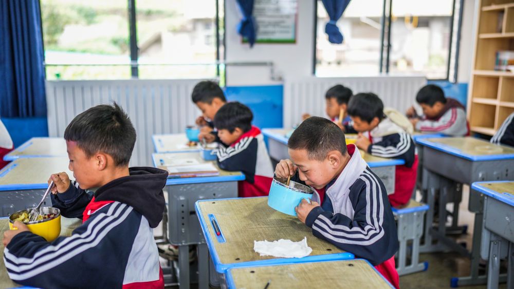 2024年11月21日,貴州省六盤水市水城區(qū)阿戛鎮(zhèn)亮巖小學(xué)的學(xué)生在供暖的教室內(nèi)吃午飯。阿戛鎮(zhèn)地處烏蒙山區(qū),海拔高,冬季潮濕寒冷。2023年以來,當(dāng)?shù)卮罅ν七M(jìn)高海拔農(nóng)村學(xué)校供暖項目建設(shè),讓孩子們溫暖過冬。
