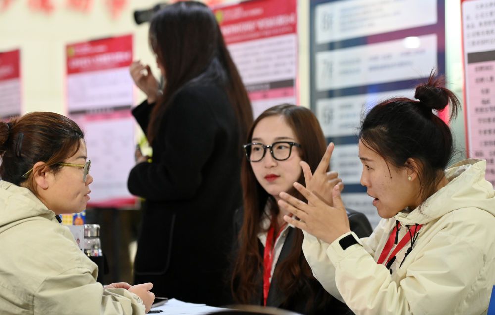 2025年3月26日,天津市殘聯(lián)和天津市教委在天津城市職業(yè)學(xué)院聯(lián)合舉辦“攜手同行 津彩就業(yè)”2025年高校殘疾人畢業(yè)生專場招聘活動,為2025年應(yīng)屆高校殘疾人畢業(yè)生及往屆離校未就業(yè)的殘疾人畢業(yè)生提供100余個工作崗位。這是招聘單位工作人員(右一)通過手語和求職的殘障人士溝通。