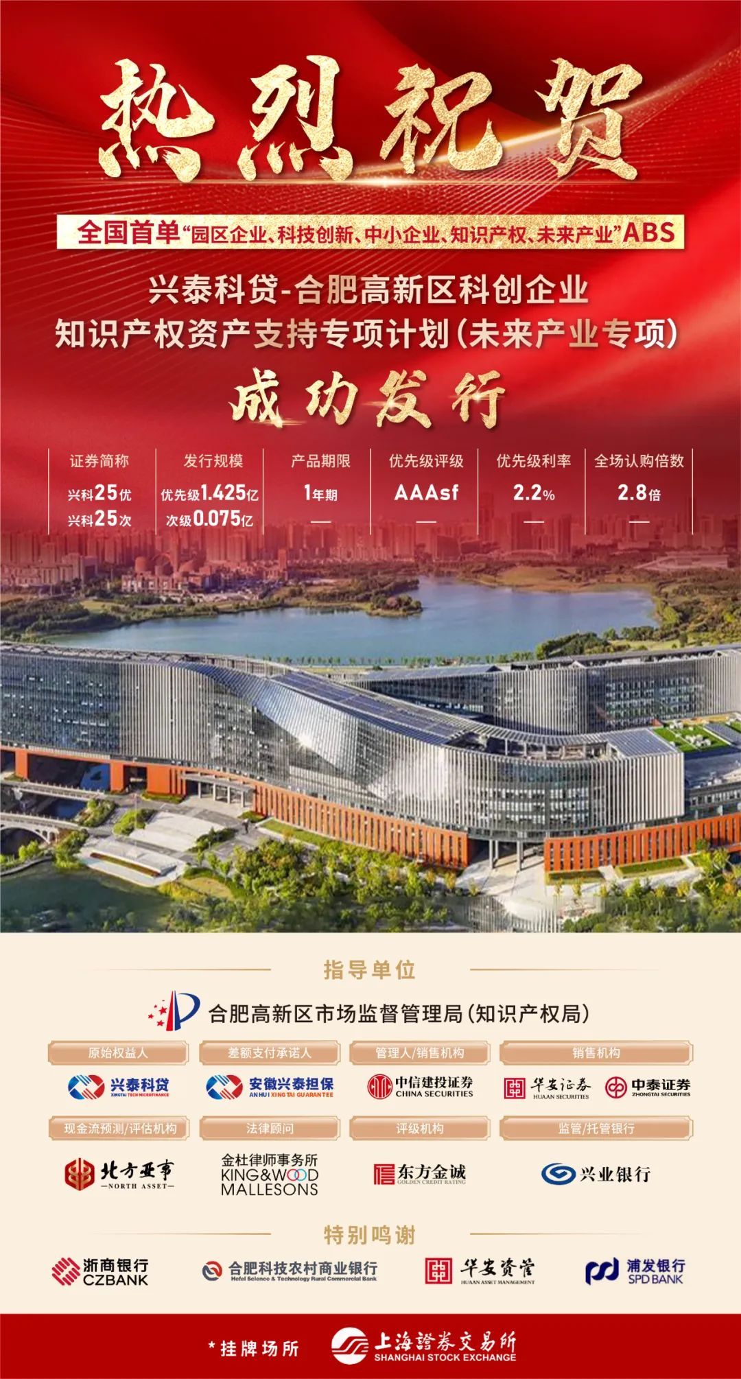 近日,由合肥高新區(qū)主導(dǎo)、興泰科貸牽頭實(shí)施的全國(guó)首單聚焦未來(lái)產(chǎn)業(yè)的知識(shí)產(chǎn)權(quán)證券化產(chǎn)品成功發(fā)行,首期發(fā)行規(guī)模達(dá)1.5億元。