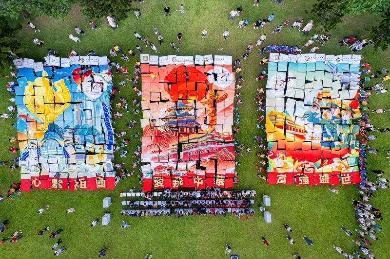 在中山紀(jì)念公園,180余所學(xué)校的約千名師生家長共同拼出3幅巨型拼圖:愛我中華、富強(qiáng)盛世、心系祖國?!跋M⒆觽儼褠蹏姆N子埋入心靈深處,為國家的繁榮昌盛作出貢獻(xiàn)?!被顒又鬓k者之一、香港區(qū)家長教師會聯(lián)會主席丁柏希說。