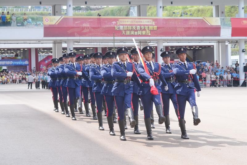 10月1日,香港紀(jì)律部隊(duì)連同青少年制服團(tuán)體在消防及救護(hù)學(xué)院舉行升旗禮及匯演。圖為紀(jì)律部隊(duì)儀仗隊(duì)及青少年制服團(tuán)體以中式步操進(jìn)場。新華社發(fā)(香港特區(qū)政府供圖)