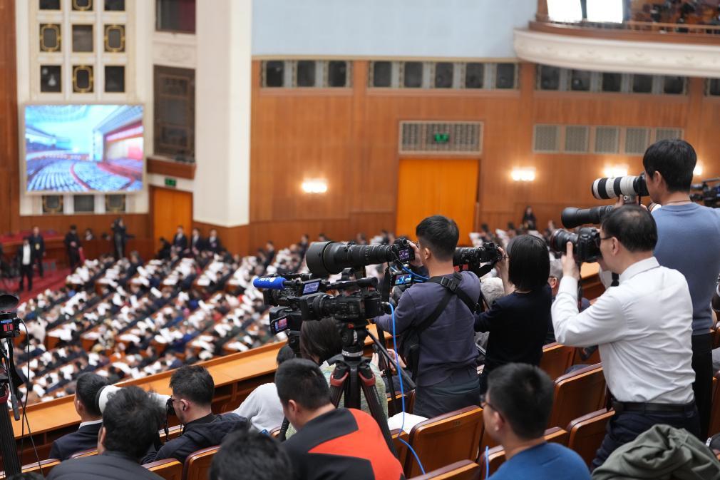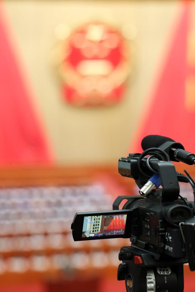 3月8日,十四屆全國人大三次會議在北京人民大會堂舉行第二次全體會議。這是記者在會場采訪。