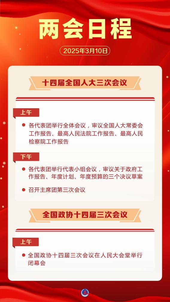 新華社北京3月9日電 十四屆全國人大三次會(huì)議各代表團(tuán)10日上午舉行全體會(huì)議,審議全國人大常委會(huì)工作報(bào)告、最高人民法院工作報(bào)告、最高人民檢察院工作報(bào)告。下午,各代表團(tuán)舉行代表小組會(huì)議,審議關(guān)于政府工作報(bào)告、年度計(jì)劃、年度預(yù)算的三個(gè)決議草案;召開主席團(tuán)第三次會(huì)議。