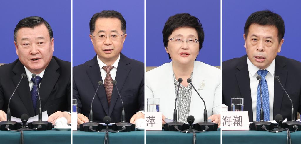 3月9日,十四屆全國人大三次會(huì)議在北京梅地亞中心新聞發(fā)布廳舉行記者會(huì)。民政部部長陸治原(左二)、人力資源和社會(huì)保障部部長王曉萍(右二)、住房和城鄉(xiāng)建設(shè)部部長倪虹(左一)、國家衛(wèi)生健康委員會(huì)主任雷海潮(右一)就民政、就業(yè)和社會(huì)保障、住房、衛(wèi)生健康等相關(guān)問題回答中外記者提問(拼版照片)。