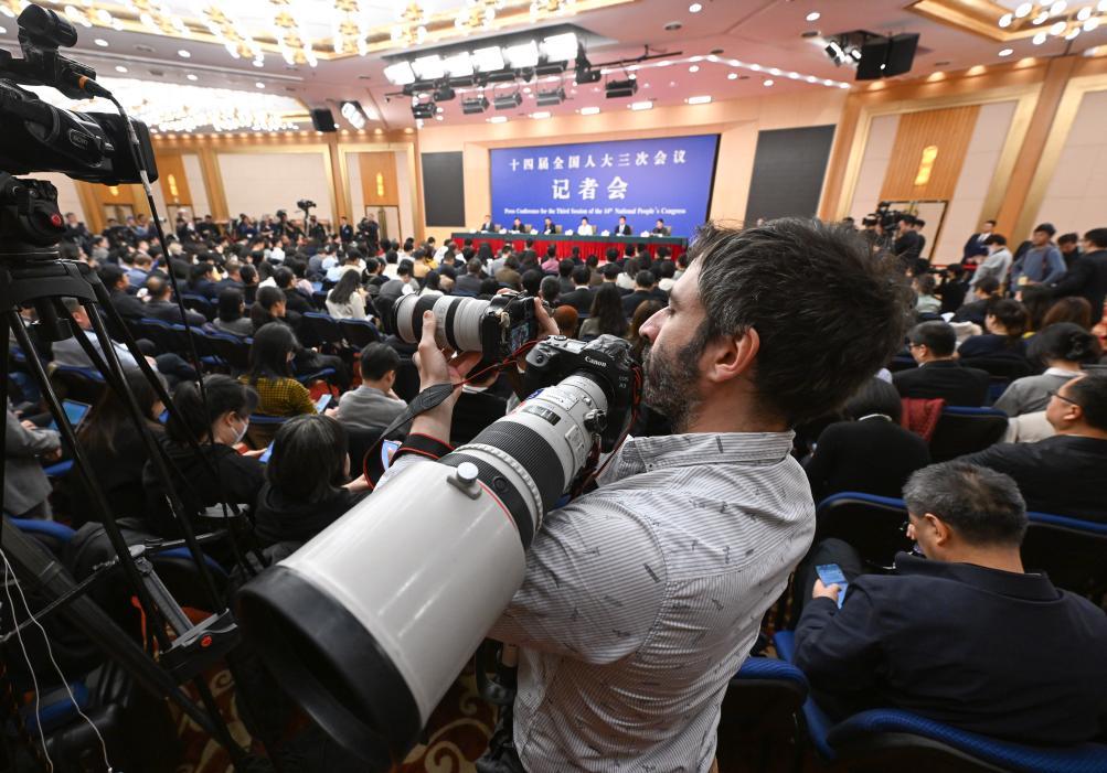 3月9日,十四屆全國人大三次會(huì)議在北京梅地亞中心新聞發(fā)布廳舉行記者會(huì)。民政部部長陸治原、人力資源和社會(huì)保障部部長王曉萍、住房和城鄉(xiāng)建設(shè)部部長倪虹、國家衛(wèi)生健康委員會(huì)主任雷海潮就民政、就業(yè)和社會(huì)保障、住房、衛(wèi)生健康等相關(guān)問題回答中外記者提問。這是記者在現(xiàn)場(chǎng)采訪。