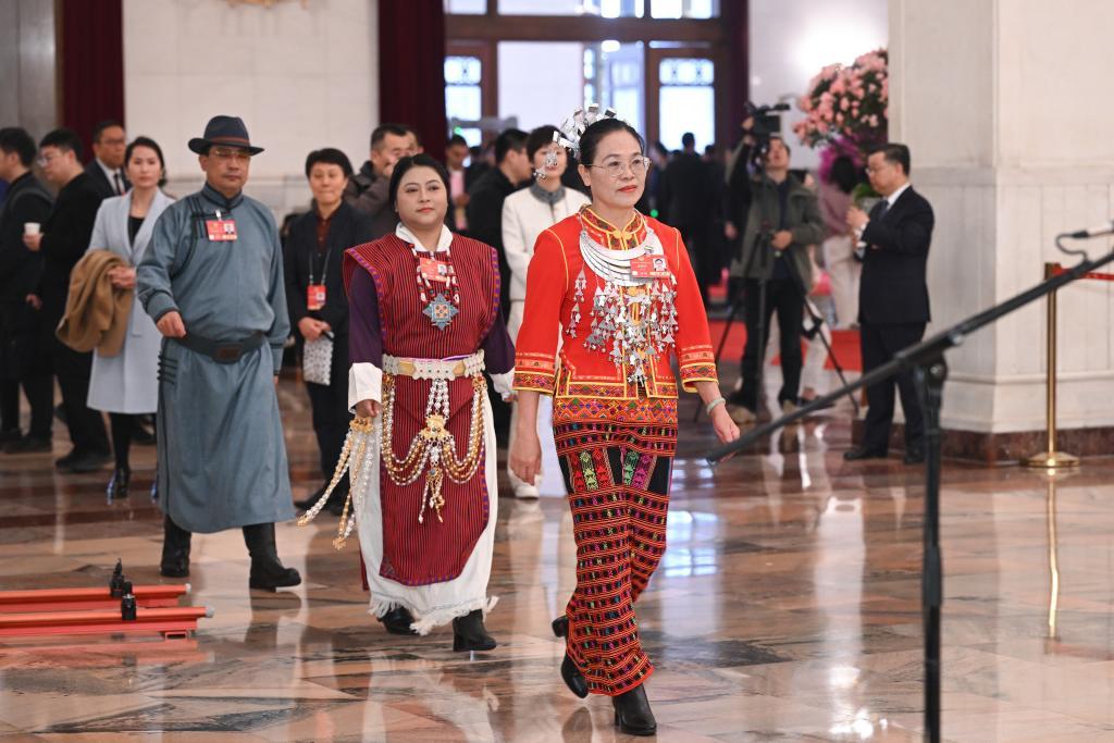 3月10日,全國政協(xié)十四屆三次會議第三場“委員通道”集體采訪活動在北京人民大會堂舉行。這是接受采訪的全國政協(xié)委員入場。